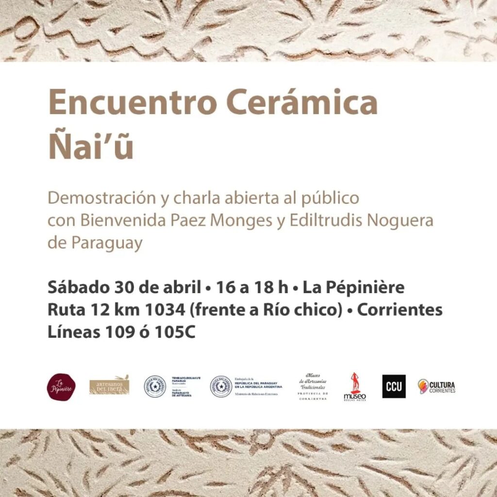 El mismo sábado, a las 16, habrá un encuentro de intercambio de saberes, charla y demostraciones de los conocimientos de alfarería, modelado, esgrafiado y la transmisión de saberes ancestrales a cargo de Bienvenida Páez Monges y Ediltrudis Noguera. Se llevará a cabo en el taller La Pepiniere, ruta 12 km 1034 (frente a Río Chico).