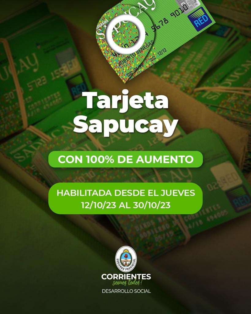 Desde el Ministerio de Desarrollo Social de la provincia de Corrientes informaron que la Tarjeta Sapucay tendrá, a partir de este jueves, un aumento del 100 % en su capacidad de compra para productos de primera necesidad. Las mismas estarán habilitadas para su uso del 12 al 30 de este mes de octubre, permitiendo así a 53.752 familias paliar la grave crisis inflacionaria que atraviesa el país, ante la cual, el Gobierno de Corrientes tomó esta decisión en pos de brindar ayuda a los sectores más vulnerables de la sociedad.