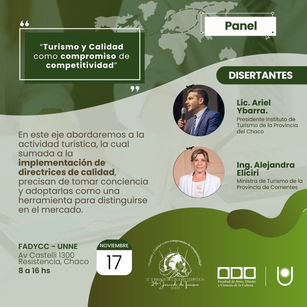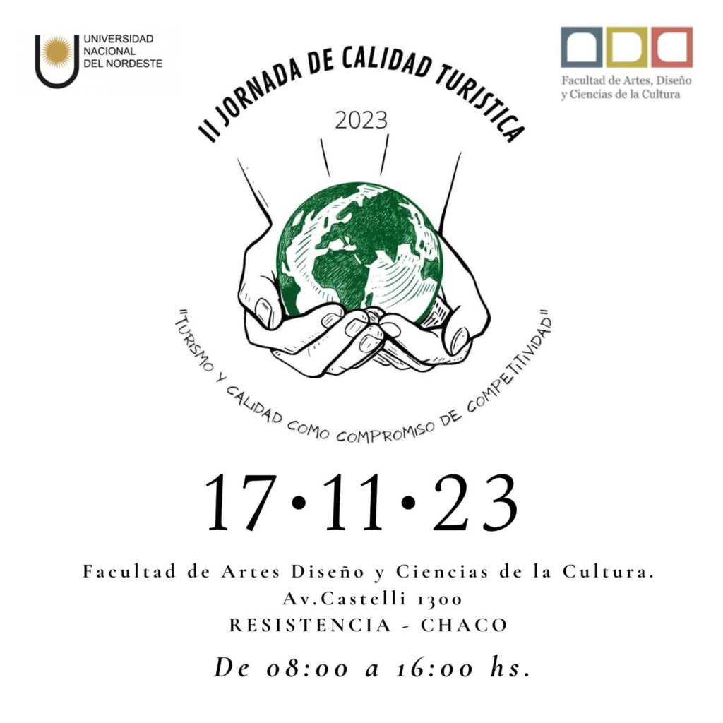La Facultad de Artes, Diseño y Ciencias de la Cultura, en colaboración con la Cátedra de Taller de Práctica I: Gestión de Calidad Turística de la Licenciatura en Turismo, organizan la 2da Jornada de Calidad Turística y 24ª del Día Internacional del Turismo: la misma se llevará a cabo este viernes 17 de noviembre, de 8 a 16 horas en las instalaciones de FADYCC – UNNE, -Avenida Castelli 1300- Resistencia, Chaco. La Jornada, con Resolución 80-2023-01732 se desarrollará bajo el lema «Turismo y Calidad como Compromiso de Competitividad».