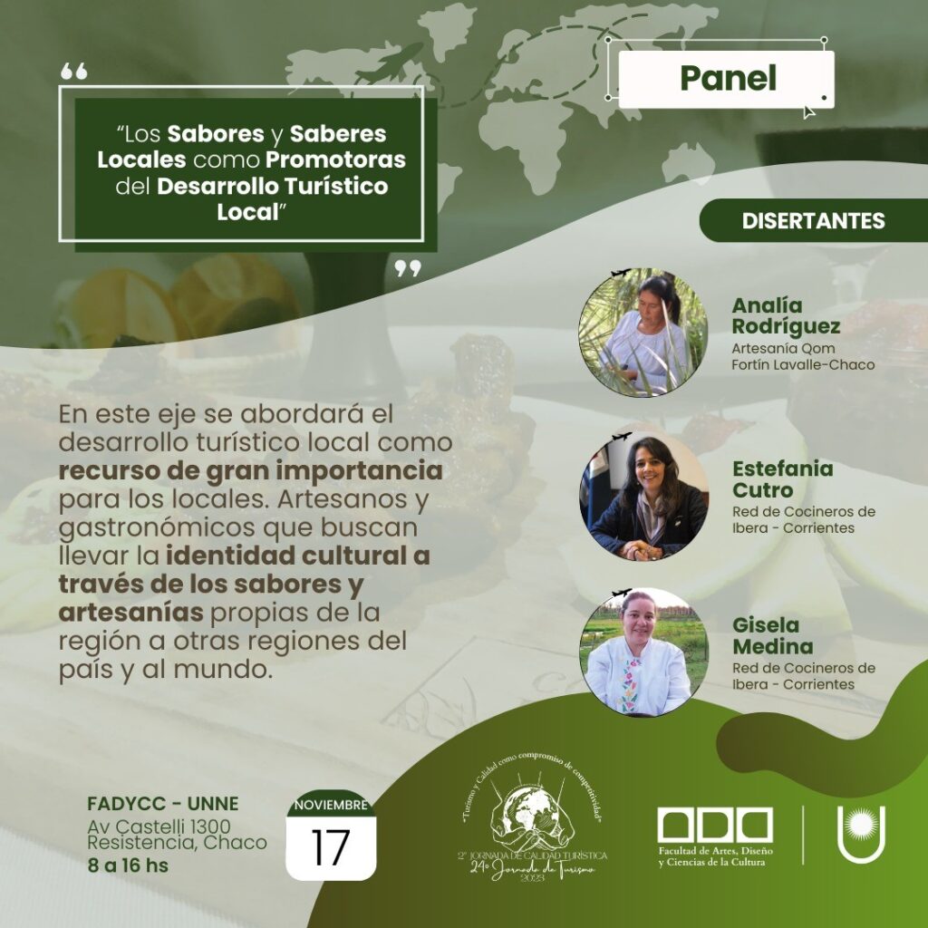 Será un momento de encuentro para que destacados panelistas vuelquen su mirada y al mismo tiempo compartan experiencias con los presentes abordando diferentes temáticas. “Turismo y Calidad como compromiso de competitividad” tendrá como disertantes a Ariel Ybarra, presidente del Instituto de Turismo del Chaco y a Alejandra Eliciri, ministra de Turismo de Corrientes. “Los sabores y saberes locales como promotores del desarrollo local” tendrá como expositores a Analía Rodríguez, artesana Qom de Fortín Lavalle (Chaco); mientras que en representación de la Red de Cocineros del Iberá (Corrientes) lo harán Estefanía Cutro y Gisela Medina.