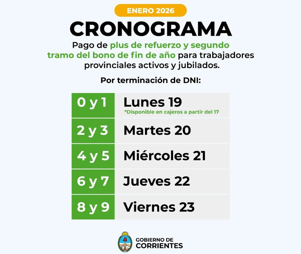 Los agentes de la administración pública provincial de Corrientes percibirán el Plus de Refuerzo de enero y, en simultáneo, el segundo tramo del Bono Navideño, entre este lunes 19 y viernes 23 de este mes. El pago alcanza a activos, jubilados y pensionados provinciales.