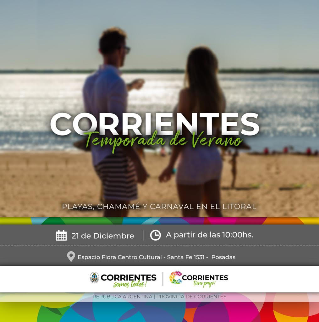 Culminando el recorrido de promoción regional, la Provincia de Corrientes dirá presente este miércoles 21 de diciembre, a las 10 horas en Espacio Flora Centro Cultural de la ciudad de Posadas, Misiones. Funcionarios del Ministerio de Turismo, acompañado de representante de municipios correntinos serán los encargados de dar a conocer la variada oferta turística para vivir esta temporada de verano.