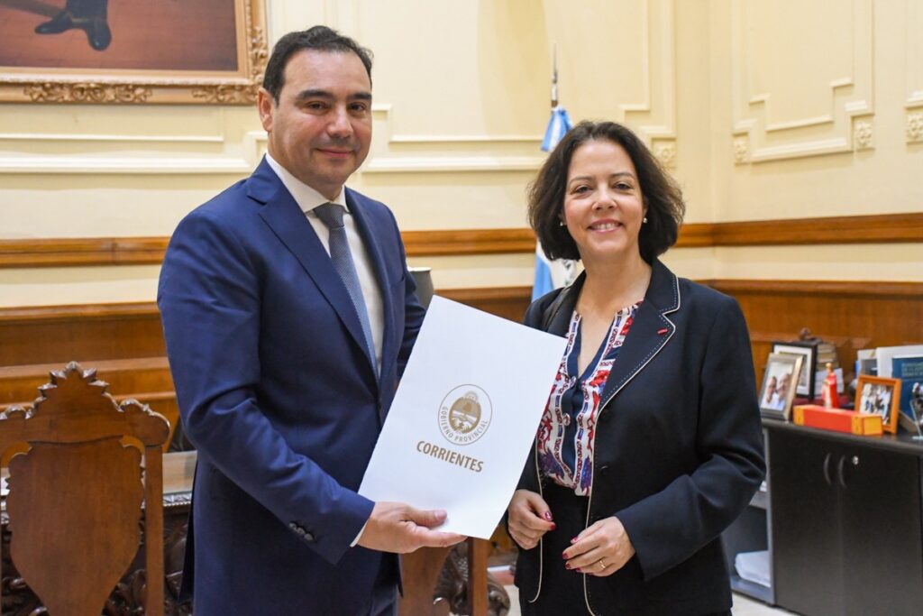 El gobernador Gustavo Valdés recibió este viernes a la embajadora de Francia en Argentina, Claudia Scherer-Effosse, como parte de su tercer día de estadía en la provincia. Durante el encuentro, “estuve hablando de todas las oportunidades que tiene Corrientes en materia productiva”, expresó la diplomática. La reunión tuvo lugar en el despacho oficial del mandatario, donde ambos, además, intercambiaron presentes alusivos a cada región.